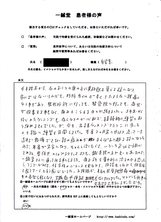 4年程前から、 右のおしりの奥の方に違和感を覚える様になり 常にではないけれども、 時折歩くのが辛くてたまらない程痛くなる事があり、 整形外科に行っても、整骨院に行っても 症状が改善する事もなく、 痛みをこらえる日々が続きました。 5年前から始めたランニングも 痛くなるのが心配で積極的に練習に 取り組めませんでした。が、 今年 名古屋ウィメンズマラソンに 当たったのを機に練習を再開しました。 本番2ヶ月前にやはり走っている途中で 我慢できない程の痛みが ひんぱんに怒る様になったので 本番が不安になり ちゃんと治したくて いろいろネットで調べてみると 整体やカイロプラクティスよりも 鍼灸院の方が良いとあったので、 一鍼堂さんに通ってみる事にしました。