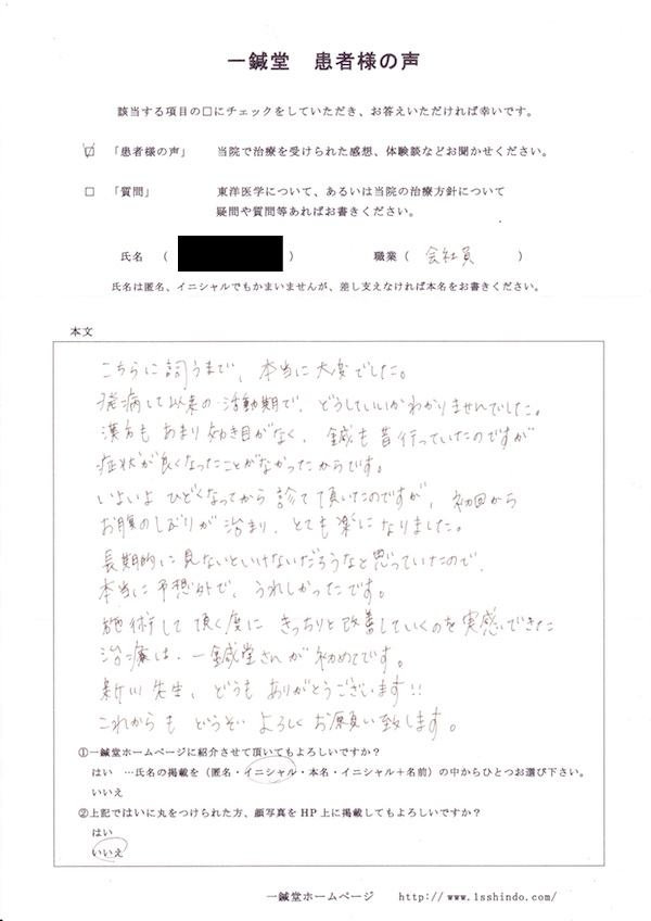 【体験談】 こちらに伺うまで、本当に大変でした。 発病して以来の活動期で、どうしていいかわかりませんでした。 漢方もあまり効き目がなく、鍼も昔行っていたのですが、 症状が良くなったことがなかったからです。 いよいよひどくなってから診て頂いたのですが、 初回からお腹のしぶりが治まり、とても楽になりました。 長期的に見ないといけないだろうなと思っていたので、 本当に予想外で、うれしかったです。 施術して頂く度に きっちりと改善していくのを実感できた治療は、 一鍼堂さんが初めてです。 新川先生、どうもありがとうございます!! これからもどうぞよろしくお願い致します。