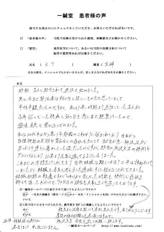不妊症…兵庫県明石市のK.T様の鍼灸体験談 | 僕らと患者様の努力の結晶。鍼灸治療と東洋医学の有効性を世に。|