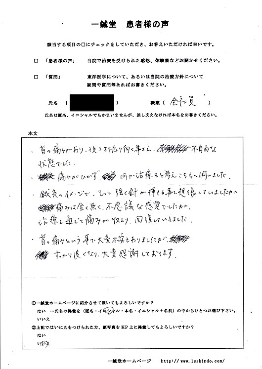 首の痛みという事で 大変不安もありましたが、 すっかり良くなり、 大変感謝しております。