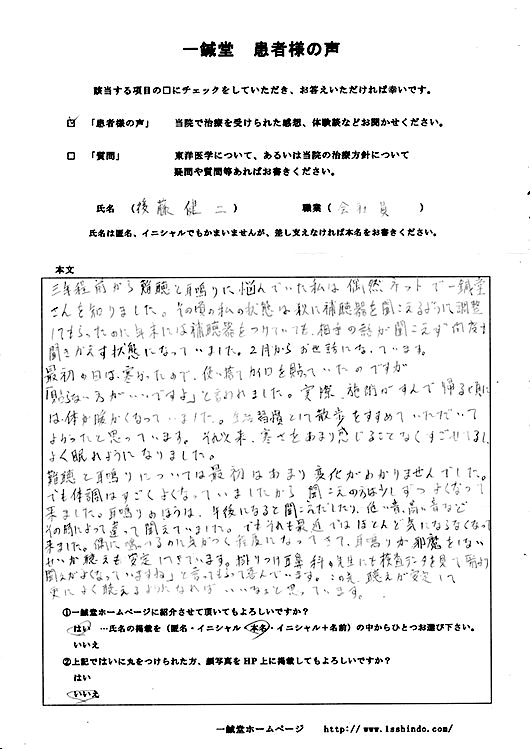 【体験談】 三年程前から難聴と耳鳴りに悩んでいた私は 偶然ネットで一鍼堂さんを知りました。 その頃の私の状態は秋に補聴器を聞こえるように調節してもらったのに 年末には補聴器をつけていても、相手の話が聞こえず何度も 聞きかえす状態になっていました。 2月からお世話になっています。 最初の日は寒かったので、使い捨てカイロを貼ってたのですが 「貼らない方がいいですよ」と言われました。 実際、施術がすんで帰る頃には体が暖かくなっていました。 生活習慣として散歩をすすめていただいてよかったと思っています。 それ以来、寒さをあまり感じることなくすごせてるし、 よく眠れるようになりました。 難聴と耳鳴りについては最初はあまり変化がわかりませんでした。 でも体調はすごくよくなっていましたから 聞こえの方は少しずつよくなって来ました。 耳鳴りのほうは、午後になると聞こえだしたり、 低い音、高い音などその時によって違って聞こえていました。 でもそれも最近ではほとんど気にならなくなって来ました。 偶に鳴っているのに気がつく程度になってきて、 耳鳴りが邪魔をしないせいか聴こえも安定してきています。 掛かりつけ耳鼻科の先生にも検査データを見て 「前より聞こえがよくなっていますね」と言ってもらって喜んでいます。 この先、聴こえが安定して更に よく聴こえるようになればいいなと思っています。