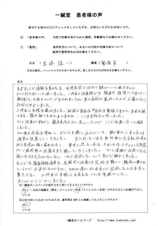 二件目に当院を選びました。 初診で先生は 『症状は警報ですから、原因を調べます。顔は触りません。』 と言われ、ここは本物だと思いました。 そして治療が終わり、鏡を見たら少し戻っていたので ここで間違いないと確信しました。 その後も問診を重ねて、ポイントを絞り込んでいき 鍼の数が二本になっても確実に改善していきました。 足に打った一本は数秒後には 全身に血液が巡る感覚が強く現れたり、 背中に打った一本は十センチ位モヤッとした感覚が 一週間後の治療日まで続いていたりしました。 そして最後の治療で打った鍼には何も反応がなくなり、 これで完治したという感じで終わりました。