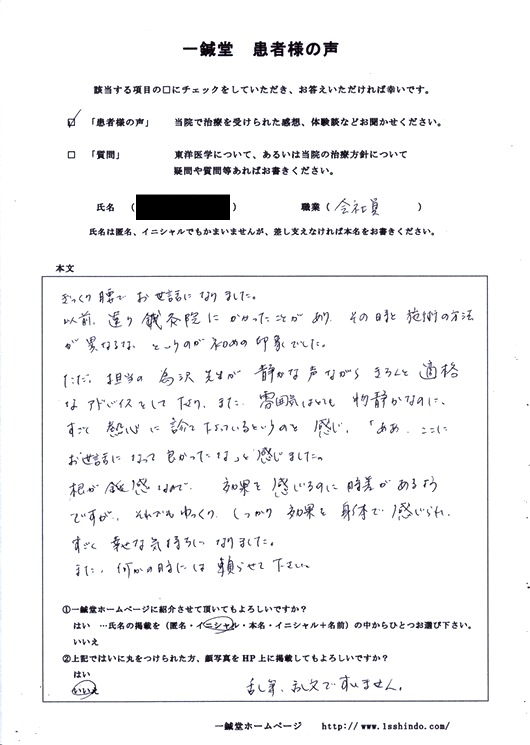 【体験談】 ぎっくり腰でお世話になりました。 以前、違う鍼灸院にかかったことがあり その時と施術方法が異なるな というのが初めの印象でした。 ただ、担当の為沢先生が静かな声ながら きちんと適格なアドバイスをして下さり、 また雰囲気はとても物静かなのに、 すごく熱心に診て下さるという感じ。 「ああ、ここにお世話になって良かったな」と感じました。 根が鈍感なので、効果を感じるのに時差があるようですが、 それでもゆっくり、しっかり効果を身体で感じられ すごく幸せな気持ちになりました。 また、何かの時には頼らせて下さい。
