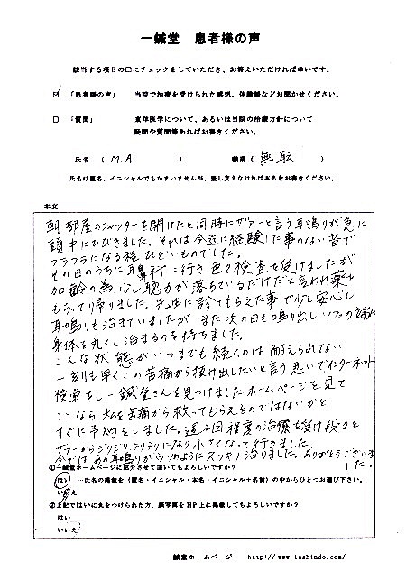 先生に診てもらえた事で少し安心し 耳鳴りも治まっていましたが、また次の日も鳴り出し ソファの端に身体を丸くし治まるのを待ちました。 こんな状態がいつまでも続くのは耐えられない 一刻も早くこの苦痛から抜け出したいと言う思いで インターネット検索をし、一鍼堂さんを見つけましたが ホームページを見てここなら私の苦痛を 救ってもらえるのではないかとすぐに予約をしました。