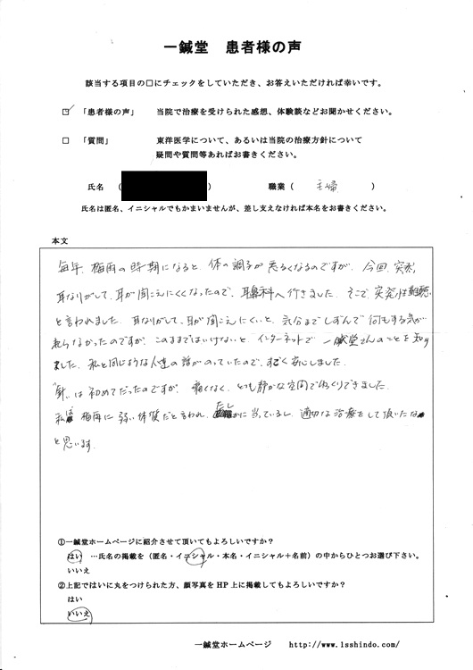 耳なりがして耳が聞こえにくいと 気分までしずんで何もする気が起こらなかったのですが、 このままではいけないと インターネットで一鍼堂さんのことを知りました。 私と同じような人達の話がのっていたので すごく安心しました。 〝針〟は初めてだったのですが、痛くなく とても静かな空間でゆっくりできました。 私は梅雨に弱い体質だと言われ、 たしかに当っているし、 適切な治療をして頂いたなと思います。