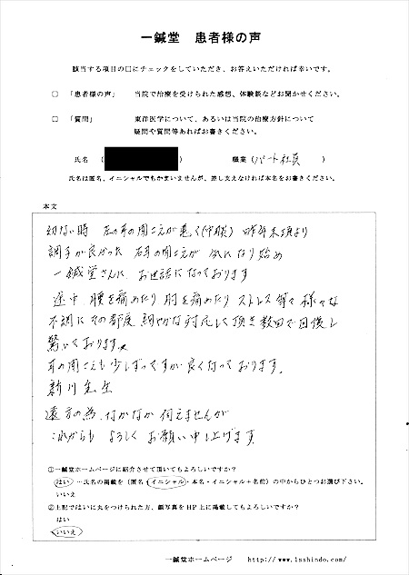 幼ない時 左の耳の聞こえが悪く(中耳炎) 昨年末頃より調子が良かった右耳の聞こえが気になり始め 一鍼堂さんに、お世話になっております。 途中、腰を痛めたり、肘を痛めたり、ストレス等々 様々な不調にその都度細やかな対応して頂き 数回で回復し驚いております。 耳の聞こえも少しずつですが良くなっております。 新川先生 遠方の為、なかなか伺えませんが、 これからもよろしくお願い申し上げます。