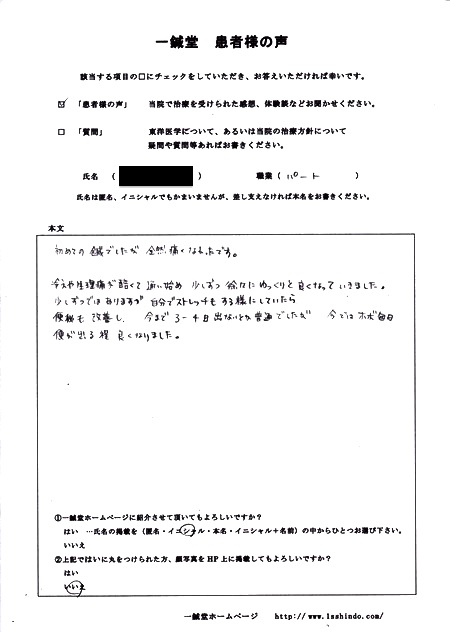 初めての鍼でしたが全然痛くなかったです。 冷えや生理痛が酷くて通い始め 少しずつ徐々にゆっくり良くなっていきました。 便秘も改善し、今まで3ー4日出ないとか 普通でしたが今ではホボ毎日便が出る程良くなりました。