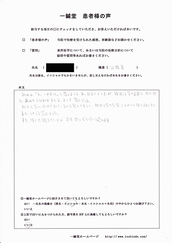 【体験談】 初めは「えっ これだけ」と思うような、 あっけなさでしたが、施術を受ける度に 日に日に痛みやしびれがなくなっていき驚きでした。 何やら気の流れ?みたいなものを整えてもらい、 施術を受けた後、 じんわりと体に効いてくるというような感じでした。 また、体に不調をきたせば是非診てもらいたいと思います。