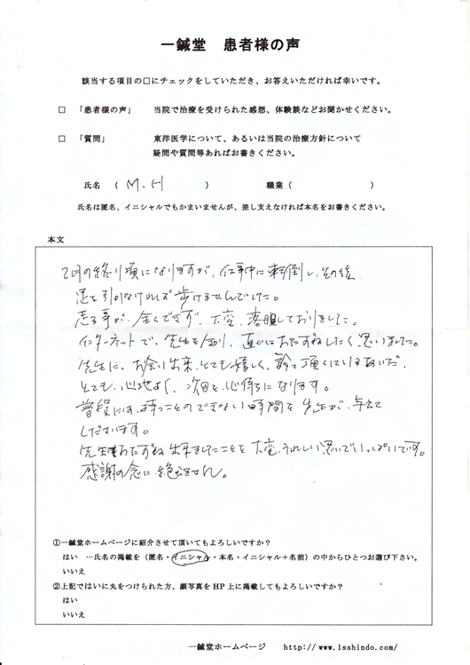 2月の終り頃になりますが、仕事中に転倒し その後、足を引かなければ歩けませんでした。 走る事が全くできず、大変落胆しておりました。