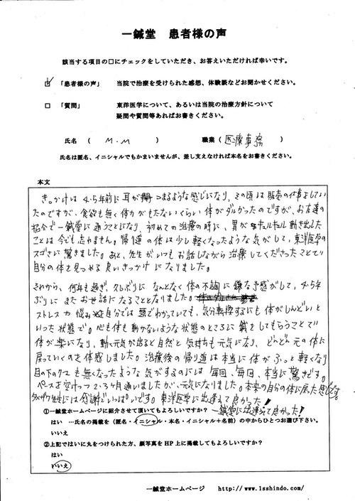 【体験談】 きっかけは4~5年前に 耳がつまるような感じになり、 その頃は販売の仕事をしていたのですが、 食欲も無く体力がもたないくらい 体がダルかったのですが、 お友達の紹介で一鍼堂に通うことになり、 初めての治療の時に、 胃がキュルキュル動き出したことは今でも忘れません。 帰り道の体は少し軽くなったような気がして、 東洋医学のスゴさに驚きました。 あと、先生がいつもお話しながら 治療してくださったことで 自分の体を見つめる良いきっかけになりました。