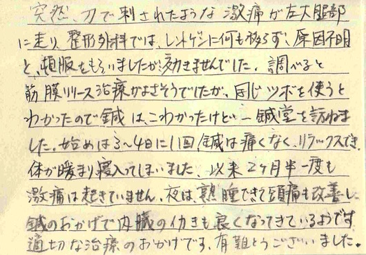 始めは3~4日に1回、 鍼は痛くなく、リラックスでき 体が暖まり寝入ってしまいました。 以来、2ヶ月半一度も激痛は起きていません。 夜は熟睡できていて頭痛も改善し 鍼のおかげで内臓の働きも 良くなってきているようです。 適切な治療のおかげです。 有難うございました。