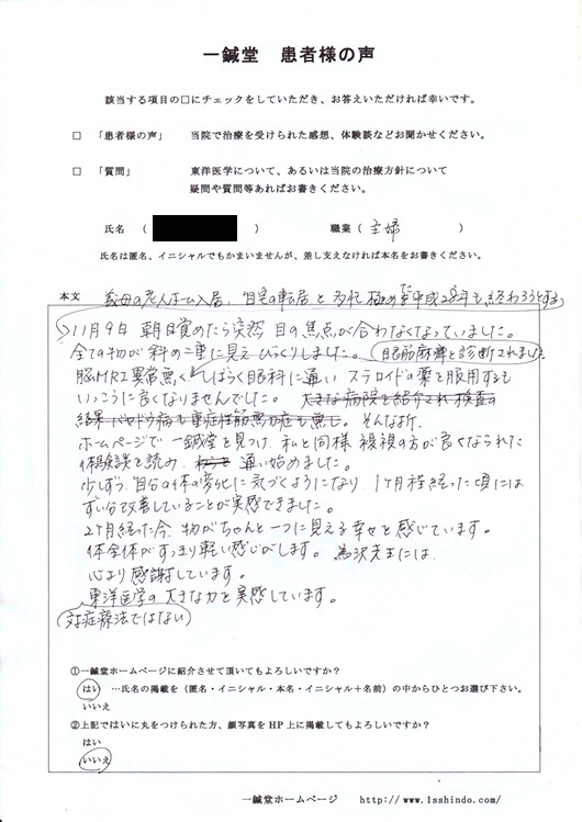 義母の老人ホーム入居、自宅の転居と 多忙極めた平成28年も終わろうとする 11月9日 朝目覚めたら突然 目の焦点が合わなくなっていました。 全ての物が斜め二重に見えてびっくりしました。 脳MRI異常無く、眼筋麻痺と診断されました。 しばらく眼科に通い、ステロイドの薬を服用するも いっこうに良くなりませんでした。 そんな所、ホームページで一鍼堂を見つけ、 私と同様 複視の方が良くなられた体験談を読み、 通い始めました。