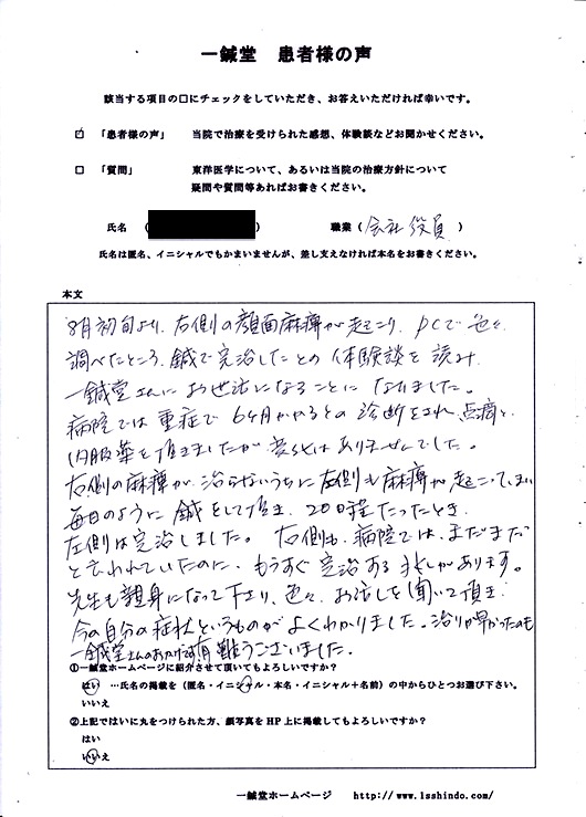 【体験談】 8月初旬より、右側の顔面麻痺が起こり PCで色々調べたところ、 鍼で完治したとの体験談を読み 一鍼堂さんにお世話になることになりました。 病院では重症で6ヶ月かかるとの診断をされ 点滴と内服薬を頂きましたが変化はありませんでした。 右側の麻痺が治らないうちに 左側も麻痺が起こってしまい 毎日のように鍼をして頂き、 20日程たったとき、左側は完治しました。