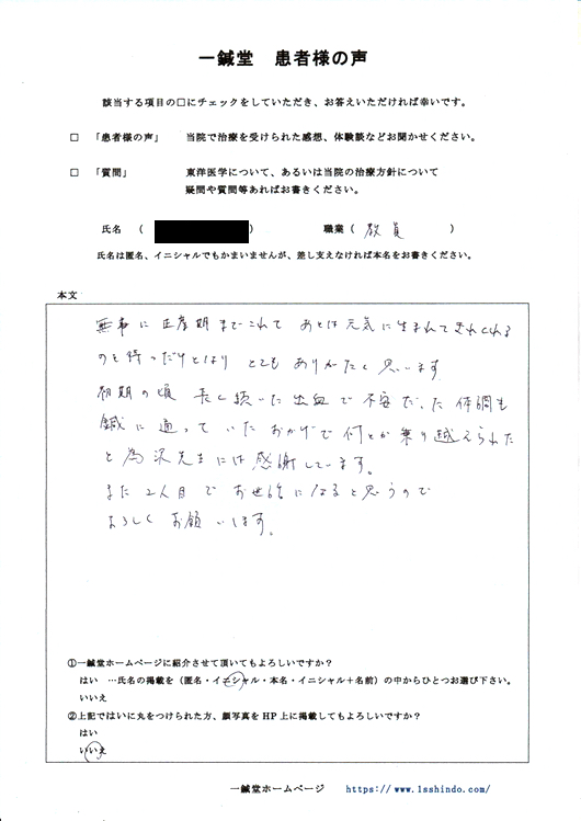 無事に正産期までこれて あとは元気に生まれてきてくれるのを待つだけとなり とてもありがたく思います。 初期の頃 長く続いた出血で不安だった体調も 鍼に通っていたおかげで何とか乗り越えられたと 為沢先生には感謝しています。 また2人目でお世話になると思うので よろしくお願いします。