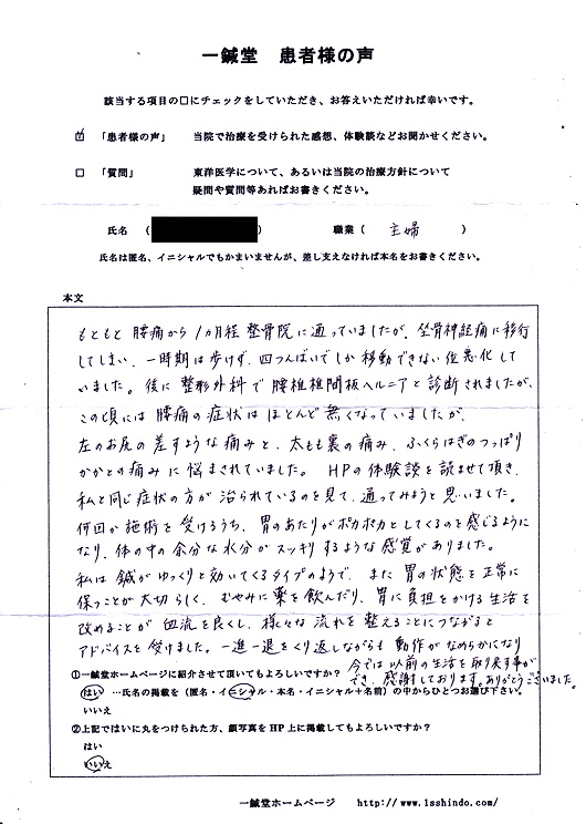 【依頼時の内容】 2010年9月末、いきなり腰痛を発症。 腰が外れたようになり、歩行困難になる。 整形外科を受診したところ、 椎間板が少し狭くなってきているといわれる。 しばらく湿布・電気治療などで通ったが善くならず、 他の整形外科でもコルセットを着けるよう言われただけで 症状改善せず。 以前肩凝りで治療を受けた鍼灸接骨院でようやく善くなり、 その後約3年間半ほど何事もなく過ごす。 去年の暮れ頃より時折、右足膝頭にピリピリ痛みを感じるようになる。 今年春頃より腰が痛み出し湿布で対応していたが、 家事で前傾姿勢を取ることがキツくなり、近所の整骨院を受診。 3週間通ううち、痛みが腰から左臀部、太もも裏に広がり、 どんどん悪化している様子の為、 一鍼堂さんへ電話予約させていただきました。