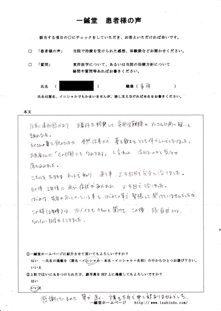 【体験談】 左耳に違和感があり、耳鼻科で診察して 突発性難聴かメニエル氏病の疑いと言われました。 たくさんの薬を飲みましたが、 全然改善せず、薬を飲むととても体がしんどくなりました。 お医者さんに「その状態にもなれます」と言われ 治らないのかと気分が落ち込みました。 こちらをたまたまネットで知り、通う事2、3回で完全に治りました。 その後2年後に再び症状があらわれ、2、3回で治りました。 はじめは、先生のおっしゃっている事を、 はじめての事で緊張して聞けていませんでしたが、 この時(2年後)は、アドバイスもきちんと聞けて、 この後同じ症状にはならない自信がでてきました。