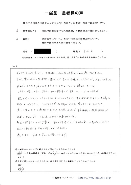 デスクワークによる肩コリ、生理痛、 冷え症 改善のために通い始めました。 今まで、整形外科・整骨院・整体など色々な治療をしてきましたが、 あまり効果が表れず、この先も痛みと 付き合っていくしかないなぁと諦めていました。 コチラに伺った時も、当初はあまり期待せず、 疑いつつ…だったのですが鍼を打ってもらい、 しばらくすると力がフッと抜け、 体中ぽかぽかする不思議な感覚が心地よく、 少しづつですが体調の変化を感じることが出来ました。 週に1度ペースの通院で3ヶ月半経過しましたが 鎮痛剤の服用回数が以前の半分になり、 月経痛はかなり改善されました。 毎回の問診をとても丁寧で、 話をする中で小さな体の変化に気付いてくださり 安心して施術をお任せすることが出来ます。 為沢先生、今後も宜しくお願い致します。