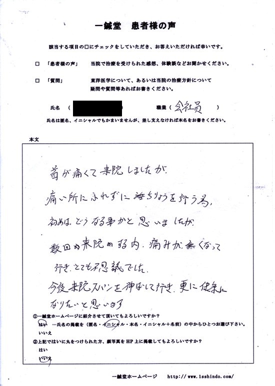 【体験談】 首が痛くて来院しましたが、 痛い所にふれずに ちりょうを行う為、 初めはどうなる事かと思いましたが、 数回来院する内、痛みが無くなって行き、 とても不思議でした。 今後来院スパンを伸ばして行き、 更に健康になりたいと思います。
