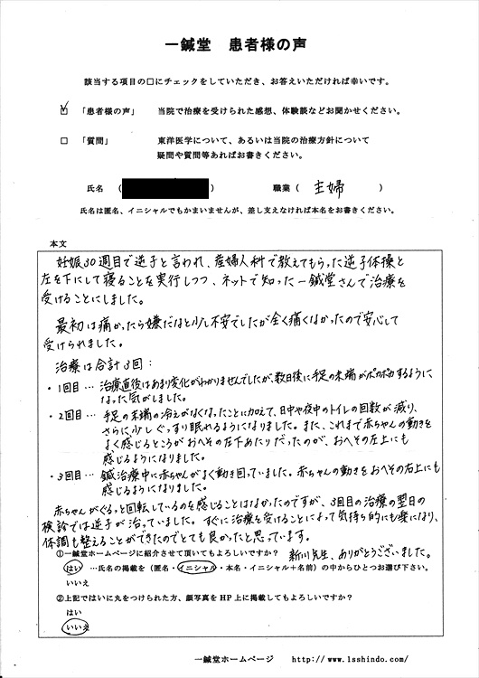 赤ちゃんがぐるっと回転しているのを感じることはなかったのですが、 3回目の治療の翌日の検診では逆子が治っていました。