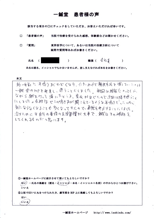 【体験談】 約一年前に耳鳴りがひどくなり、 インターネットで解決方法を探していたところ 一鍼堂のHPを発見し、通うことにしました。 初回は相談にのってもらいながら、 鍼を打って頂いたところ、変化が生じたので 次回以降も通うことにしました。 当初はセミの鳴き声が聞こえているような 耳鳴りだったのが、気にならなくなることも 多くなってきたので、通院を中止することにしました。 治すためには自分の普段の生活習慣が大事で、 鍼はその補助をしてくれるものだと思います。