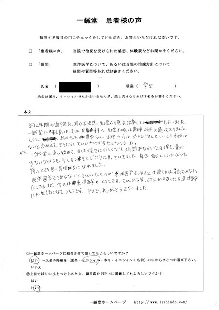 一鍼堂に来る前は、耳は耳鼻科へ。 生理不順は産婦人科に通っておりました。 しかし、耳の方は異常なし、 生理の方はピルで治していくしか方法はないと言われて、 もうどうしていいかわからなくなりました。