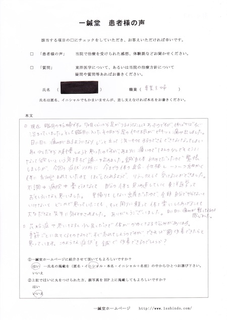 鍼自体初めてだったので緊張しましたが、 今回の症状以外に今までの体の具合、 性格と一つ一つ細かく体に刻み込まれていたのを ほぐしてくれるようで、 リラックスして受けることができました。 不調→病院→薬ではなくて 自分の体を見つめ直していく東洋医学って おもしろいなと思いました。