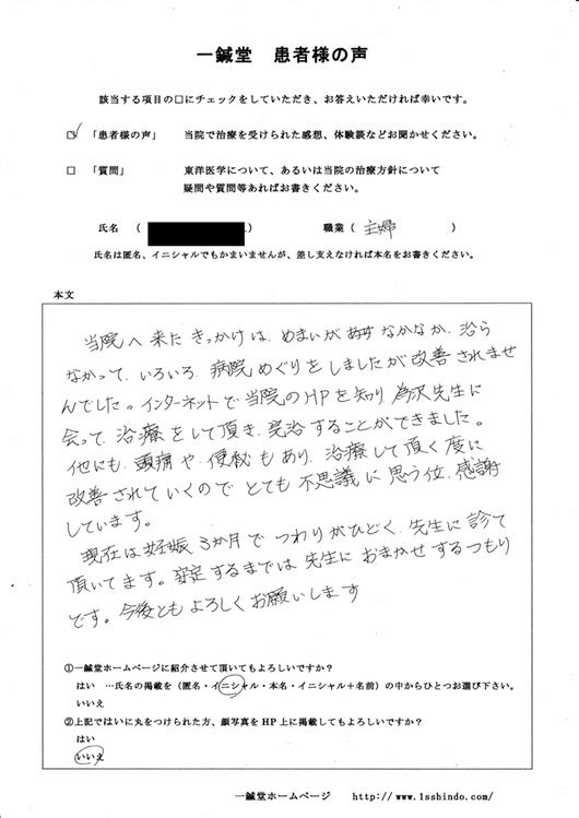 大阪 鍼灸院(心斎橋) 一鍼堂 >鍼灸治療体験談> >前庭神経炎・頭痛・便秘・不妊症の体験談