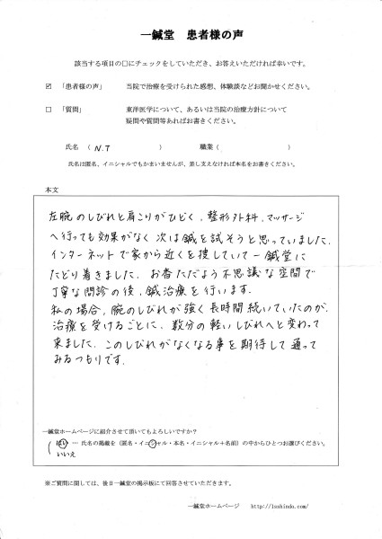 【体験談】 左腕のしびれと肩こりがひどく、整形外科、 マッサージへ行っても効果がなく 次は鍼を試そうと思っていました。 インターネットで家から近くを捜していて 一鍼堂にたどり着きました。 お香ただよう不思議な空間で 丁寧な問診の後、鍼治療を行います。 私の場合、腕のしびれが強く長時間続いていたのが、 治療を受けるごとに、 数分の軽いしびれへと変わって来ました。 このしびれがなくなる事を 期待して通ってみるつもりです。