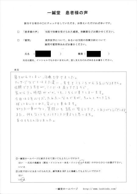 また、何もなくてもメンテナンスに来ようと思います。 首はもちろん治りました。