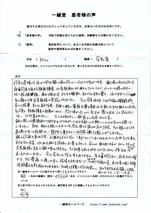 昨年、春頃から体はこの甲状腺の病に向かっていたような気がします。 職場で多大なストレス、夜は何度も起きる睡眠障害、 心房粗動でカテーテルアブレーション、 メニエール様のめまい、吐く程の頭痛、疲れは取れず、 またもや頻脈、気がつくと手足の震え、これはまずい!! 年の瀬の12月大学病院の受診となりました。 そして今年1月4日バセドウ病の確定診断。 すぐに投薬、すぐに副作用、失神と酷い薬疹、 お薬を変更しても脈は150を超えていました。 その後も、睡眠障害に拍車がかかり、何より辛かったのは 気分の落ち込む、人と話をしたくない。 イライラ集中力なし。そんな時HPで一鍼堂さんと出会ったのです。
