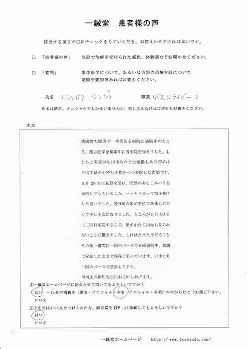 【体験談】 潰瘍性大腸炎で一年間ある病院に通院中のところ、 漢方医学を検索中に当医院を知りました。 もともと実家が吹田市なので土地勘もあり