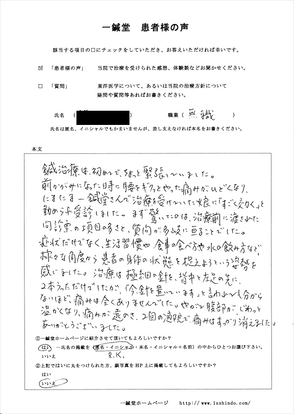 【体験談】 鍼治療は初めてで、ちょっと緊張していました。 前かがみになった時に 腰をギクっとやった痛みがひどくなり、 たまたま一鍼堂さんで治療を受けていた娘に 「すごく効く」と勧められ受診しました。