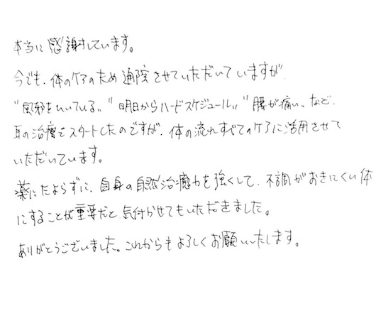 今でも、体のケアのため通院させていただいていますが、 〝風邪をひいている〟〝明日からハードスケジュール〟〝腰が痛い〟など 耳の治療でスタートしたのですが、 体の流れすべてのケアに活用させていただいています。 薬にたよらずに、自身の自然治癒力を強くして、 不調がおきにくい体にすることが重要だと気付かせていただきました。 ありがとうございました。 これからもよろしくお願いいたします。