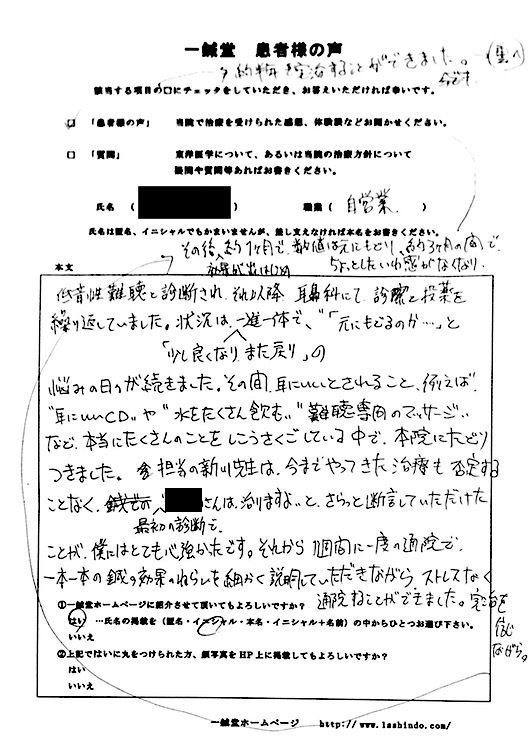 【体験談】 低音性難聴と診断され、 それ以降耳鼻科にて診察と投薬を繰り返していました。 状況は「少し良くなりまた戻り」の一進一退で、 「元にもどるのか…」と 悩みの日が続きました。 その間、耳にいいとされること、 例えば〝耳にいいCD〟や〝水をたくさん飲む〟 〝難聴専門のマッサージ〟など、 本当にたくさんのことをしこうさくごしている中で、 本院にたどりつきました。