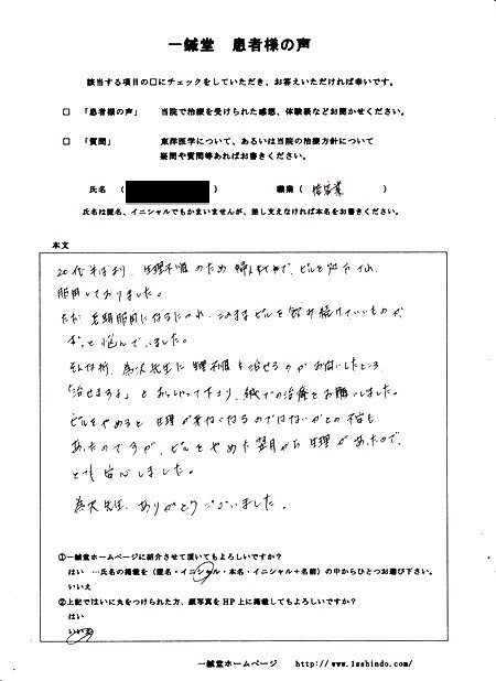 【体験談】 20代半ばより、生理不順のため婦人科で ピルを処方され服用しておりました。 ただ、長期服用になるにつれ、 このままピルを飲み続けていいものか ずっと悩んでいました。 そんな所、為沢先生に生理不順も治せるのか お伺いしたところ「治せますよ」とおっしゃって下さり、 鍼での治療をお願いしました。 ピルをやめると生理が来なくなるのではないかとの 不安もあったのですが、 ピルをやめた翌月から生理があったので とても安心しました。 為沢先生、ありがとうございました。