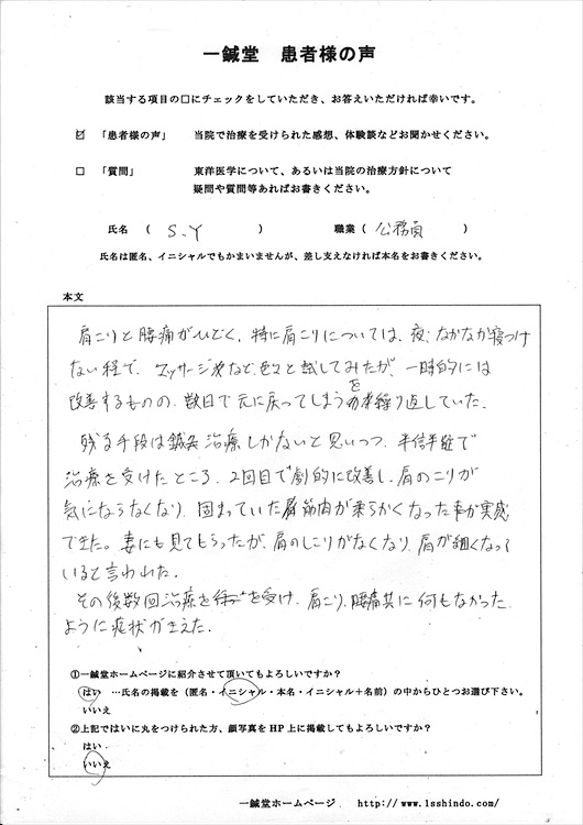 残る手段は鍼灸治療しかないと思いつつ、 半信半疑で治療を受けたところ、 2回目で劇的に改善し、 肩のこりが気にならなくなり、 固まっていた筋肉が柔らかくなった事が実感できた。 妻にも見てもらったが、肩のしこりがなくなり、 肩が細くなっていると言われた。