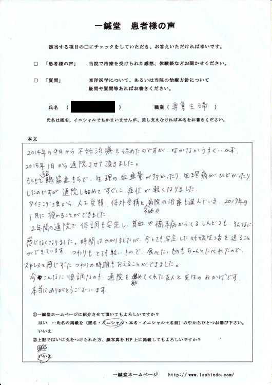 ・・・・追記:その後 2017年8月で治療卒業され、9月21日に3,510gの元気な男の子を出産しましたと御報告頂きました。S.A様、御出産おめでとうございます☆2017年10月9日