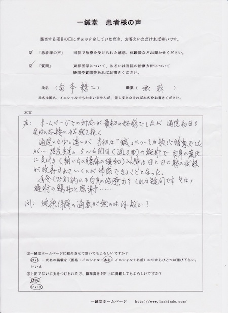 声:ホームページでの対応が最初の好感でしたが、通院初日も 受付の対応に好感を抱く 通院には少し遠いが、当初は「鍼」については疑心暗鬼でした が…。院長先生の5~6回目(週3回)の施術で自身の変化 に気付き(朝いちの腰痛の緩和)以降は日に日に躰の状態 が改善されていくのが体感できることとなった。 齢(75才)的にも自身の治癒力?これは疑問です。やはり 施術の賜物と感謝…