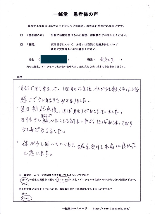 ・体が少し固いせいもあり、 鍼を受けて本当に良かったと思います。