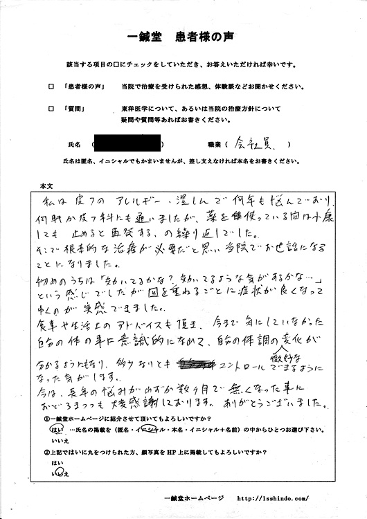【依頼時の内容】 アレルギー性の皮膚湿疹です。 皮膚科では疲れなどが溜まると出ると診断され、 抗生物質の内服薬、外用薬を処方されます。 それを使用している間は小康するのですが、 しばらくするとまた発症し、また薬を使用して・・・の繰り返しで なかなか根治に至らない状態が10年弱続いています。