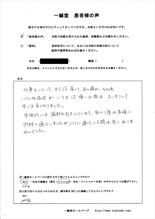 【体験談】 仕事をしていて出てくる肩こり、目の疲れ、 その他いろいろな症状がハリをして頂いた後は スッキリしてずい分良くなりました。