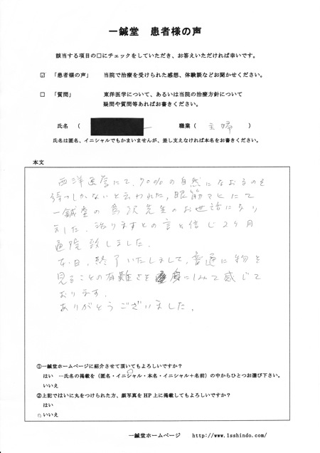 治りますとの言を信じて2ヵ月通院致しました。 本日、終了いたしまして、普通に物を見ることの有難さを 身にしみて感じております。 ありがとうございます。