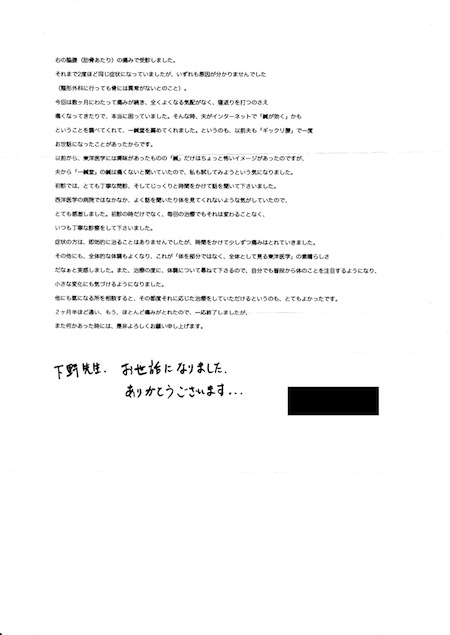 2ヶ月半ほど通い、 もう、ほとんど痛みが取れたので、 一応終了しましたが、また何かあった時には、 是非よろしくお願い申し上げます。