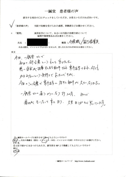 ほとんど痛みがなくなって来ており、 大変ありがたく思っています。