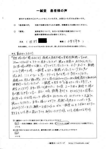 その後、2〜3回の施術で、 娘が聴こえやすいと言い、 目まい、吐気、頭痛、耳なりも、 みるみるうちに改善し、 初診から10日後ぐらいで、 娘の耳は80デシベルから10デシベルと 元通りの聴力になりました。