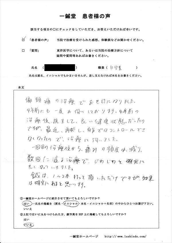 【体験談】 偏頭痛の治療でお世話になりました。 4年前にも一度お伺いしております。 4年前の治療後、摂生して、 良い健康状態だったのですが、 最近、再発し、自分ではコントロールできなくなったので、 治療に伺いました。 一回目の治療後から、痛みの頻度は減り、 数回に渡る治療で、じわじわと確実に良くなっていきました。 鍼は、1~2本打って頂いただけですが、 効果は確実にあると思います。