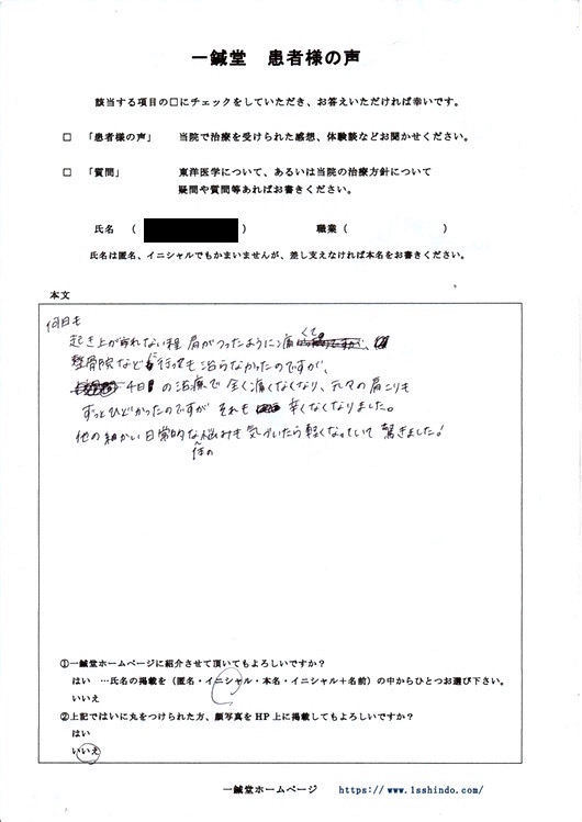 【体験談】 何日も起き上がれない程 肩がつったように痛くて 整骨院などに行っても治らなかったのですが、 4日の治療で全く痛くなくなり、 元々の肩こりもずっとひどかったのですがそれも辛くなくなりました。 他の細かい日常的な体の悩みも気づいたら軽くなっていて驚きました! (本文ママ。)