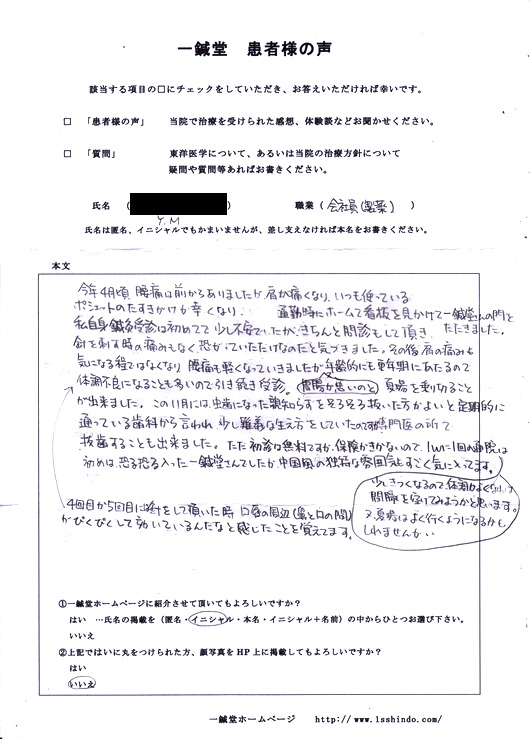 【体験談】 今年4月頃、腰痛は前からありましたが、 肩が痛くなり、いつも使っている ポシェットのたすきがけが辛くなり、 通勤時にホームで看板を見かけて 一鍼堂さんの門をたたきました。