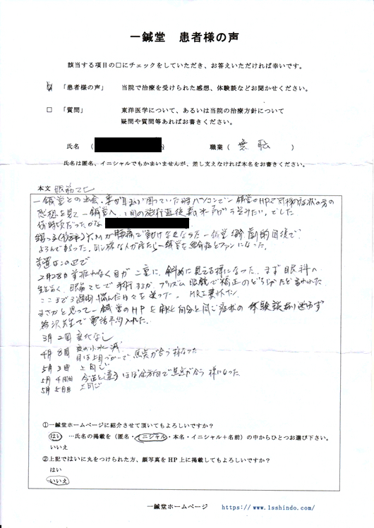 前置はこの辺で 2月28日 前ぶれもなく目が二重に、斜めに見える様になった。 まず眼科へ。先生曰く、眼筋マヒで手術するか、 プリズム眼鏡で矯正のどちらかだと言われた。 ここまで3週間悩んだ日々を送った。 MRI異常ナシ。 まさかと思って一鍼堂のHPを開くと 自分と同じ症状の体験談あり 迷わず為沢先生で電話予約入れた。