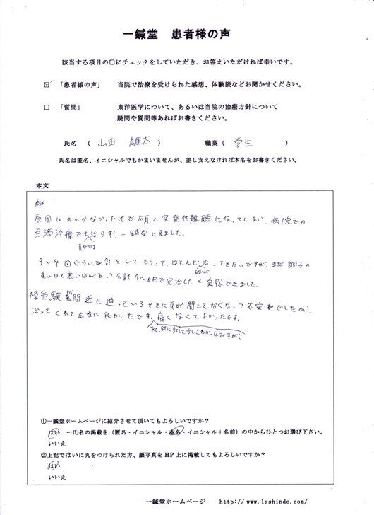 大学受験が間近に迫っているときに 耳が聞こえなくなって不安でしたが、 治ってくれて本当に良かったです。 あと、針に対して少しこわかったですが、 痛くなくてよかったです。